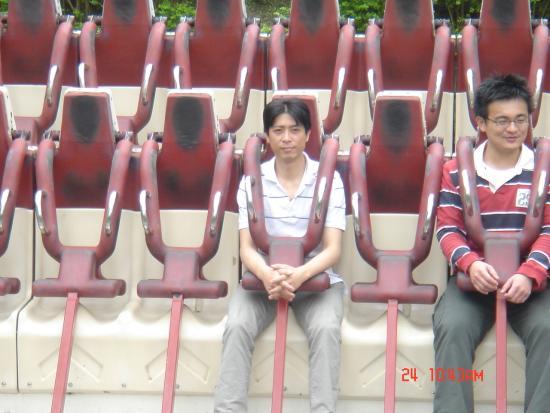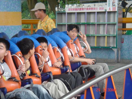 把把跟一堆小學生要去坐刺激的嚕!! 就是在半空90度停住 然後瞬間往下衝再往上 看的我們三個膽小鬼在旁尖叫 老公覺得很好玩:評為A級 後來玩過另一項後改評為B級